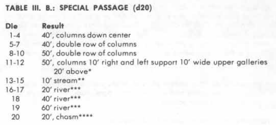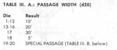 Appendix A of the DMG sets out the means in AD&D for generating dungeons. We can see that sixty percent of the time, the dungeon width will be ten feet wide, five percent of the time the passage will be five feet wide, and the remaining thirty-five percent of the time the passage will be greater than ten feet wide. And, many of the ten percent of “special passages” will be considerably wider than thirty feet wide.