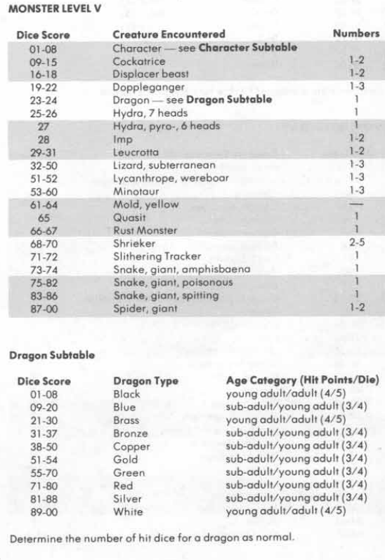 And, what dragons will be encountered. The Appendix C random dungeon monster tables show dragons on levels three and deeper. The lower one goes in the dungeon, the older the dragons met will be. It’s not until level 5 before one starts to run into adult dragons.