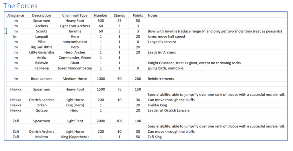 All people are stone-aged pygmy-sized people with clubs, stone-tipped spears, arrows, and javelins. The people Im ride war boars. The desert and tree people ride war ostriches. Orkan of the Heikka (desert people, sandmen) has made a secret alliance with the Zafi (tree people, jungle dwellers) against the civilized city of Im. Im and the Heikka practice interbreeding between moieties to preserve genetic diversity. Queen Rabhana of Im has been impregnated by King Orkan of the Heikka (desert people) is due to give birth. Through a series of unfortunate events, a plot between the Heikka and the Zafi (Forest Folk) to attack Im has been discovered. This has led Rabhana and her guard to flee Orkan’s camp and return across the White River to Im. Unfortunately, Rabhana goes into labor at the White River ford and cannot travel further. A rump force of the Queen’s Guard, and Im infantry must hold the White River ford against the substantially larger combined force of Heikka and Zafi. There is a force of Im cavalry coming, but who knows when it will arrive. Queen Rabhana starts in labor. The Im forces are supported by a Crusading Knight lost out of time – he has mail and a sword.
