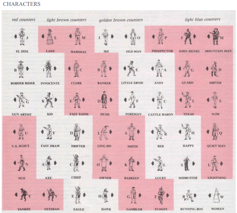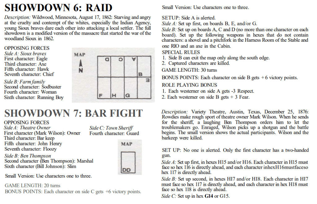 First, some discussion of terminology. Gunslinger has twenty-six standard scenarios called Showdowns. Showdowns define the forces present, board layouts, set up, special rules, game length, points, and “role playing bonus”. The Showdowns cover a fairly comprehensive list of typical wild west combat scenarios. Showdowns use Stock Characters that are defined in the game, you might think of them as archetypes or character classes.