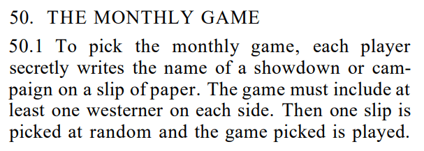 The rules don’t say this, but presumably there is a canvassing portion of the game where players have a chance to advocate for the scenario they want. For example, a monthly Showdown is more safe than a campaign because it is one Showdown whereas a month-long campaign is multiple showdowns. Advocating for one or another might bear advantages depending on which Westerner the player has available that month.