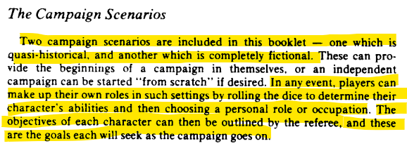 Then it discusses campaign scenarios provided in the game. There are two, really three, scenarios. One “quasi-historical”, one “completely fictional”, and also the provision for a referee to start a campaign “from scratch.” So, between editions, they deciding more discussion was needed of the dilemma of playing in a historical setting.