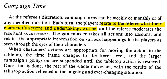 The 1979 edition retains the weekly or monthly turn structure. But it also gives more details as to how the referee manages the turns. The players relate their actions to the referee, and then the referee adjudicates while maintaining a fog of war.