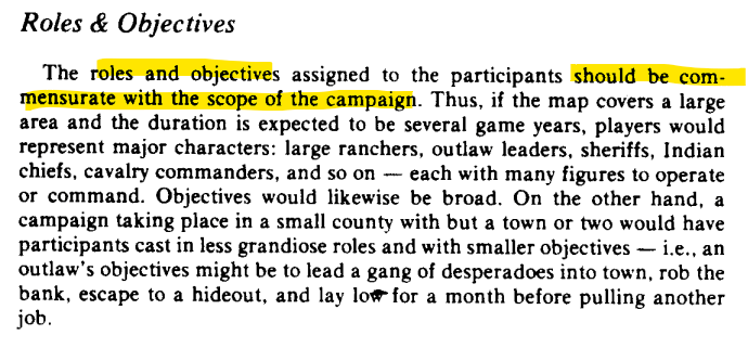 It’s pretty straight forward, is the geographic scale is large then the players should be in roles of major players in the area with men under their command. If a small region is chosen then, commensurately the focus should be on smaller objectives. This is important in that it empowers the referee to make the game into essentially a domain-scaled wargame. Or, also, a more tightly focused, more Braunstein-like activity. In the former, players are staking out territory and moving their forces about the map. In the latter, it is more tightly focuses on a place (e.g. Brownstone) and individual characters that are more frequently interacting directly.