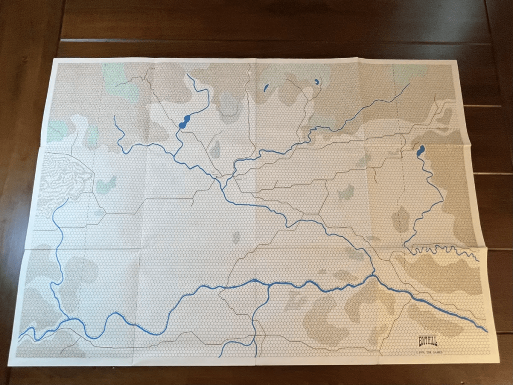 Note, the region is about 300 x 224 miles at two miles per hex (67,200 square miles). This is, near exactly, about a quarter of the size of Texas. Does it match any actual geography of Texas? Not that I know of. But, it does say that the “quasi-historical” location is set in Texas along the Great Southwester Trail near a fort and Indian Country. My guess is it is supposed to be representative of something like this area.