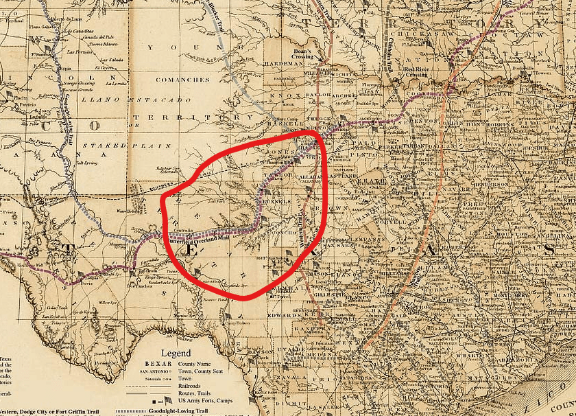A friend more knowledgeable about Texas than I say the river resemble the Rio-Pecos-Devil’s river system, but not exactly. So, generally, I’m thinking Abilene or Odessa was the model or somewhere like that. I any case, it’s almost certainly intended to be representative rather than real. The upside here is you are not beholden to history. The downside is if characters leave the bounds of the map, you have nothing to go on.