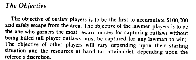 But the thing I find most interesting here is, while the player creates a character and decides on its “role or occupation” it is the referee that determines the objectives for each character. This is a step away from “total player autonomy” that I prefer. Though, presumably, a referee would be expected to set objectives based on the type of character and its profession. It would not be appropriate for a referee to take a character determined by the player to be a prospector and define that character’s goal as to start a farm and get the crop in before winter.