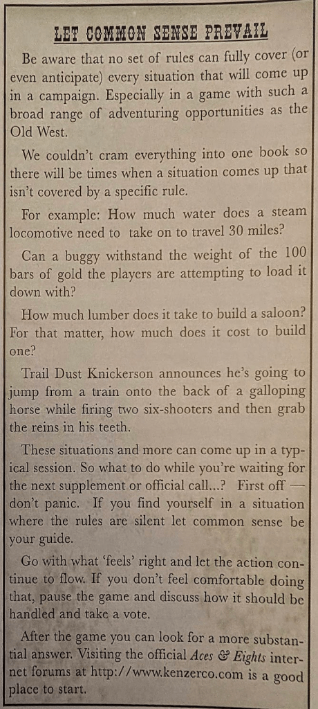 This could apply to all three games, but especially Boot Hill. The reality is that in any RPG, you are going to have to wing-it a lot of the time. The world is a complex place and no game can cover even a small fraction of it. Gunslinger is differerent because its rigid campaign structure eliminates a lot of these things.
