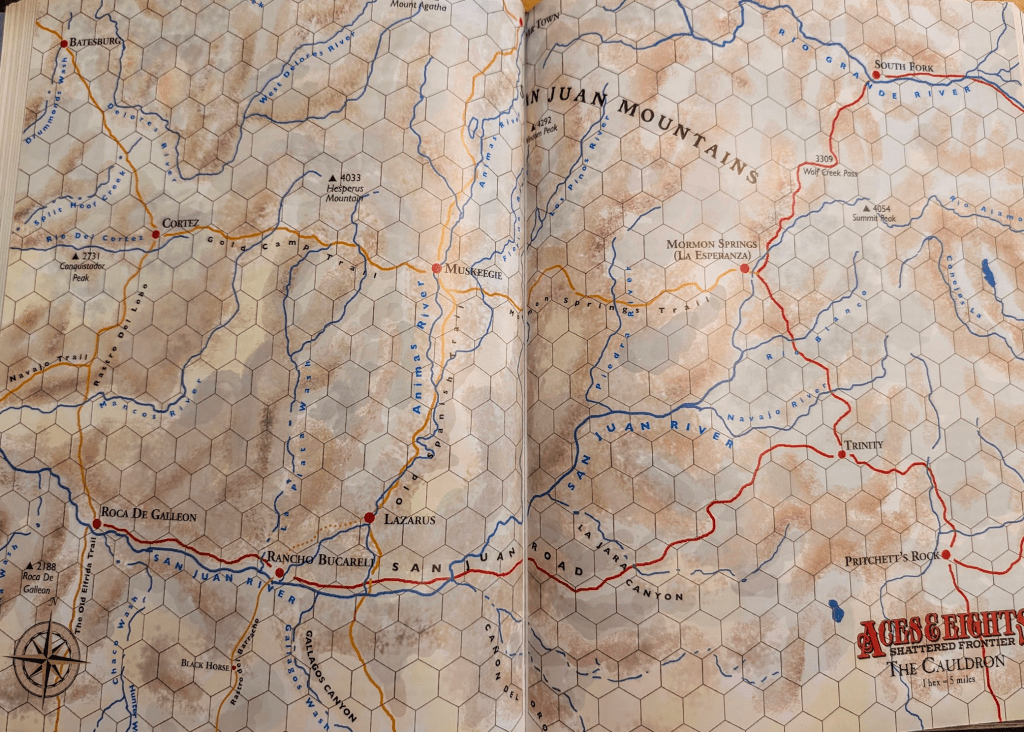 The overall campaign setting for Aces & Eights is The Shattered Frontier which is an alternative history of the west. This setting has a United States where the Civil War ran to a statement, Texas remained a seperate Republic, Mexico did not lose the Southwest and most of California, and the Mormans have set up their own country of Deseret in Alta California.
