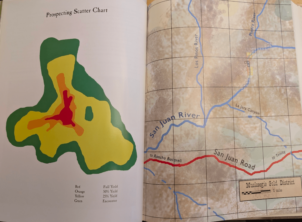 But the ranching, mining, gambling, and trials parts of the game really shine in my opinion. No other role playing game that I know of has better prospecting rules. It’s mostly about placer deposits and does not spend a lot of time on mining other loads. I think there is the assumption that players will mostly prospect, define their ore bodies then sell out to the bigger developers. Nonetheless really remarkable. The rules provide an example mining district, a map (secret to the players) for where deposits might be found, and a scatter chart to be used in defining the actual deposits if one is found.
