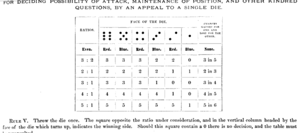 In Strategos, one of the early tables in the second book of the game has shows a means of resolving attacks. It gives odds ratios in the left colump. The top columb shows the roll of a die. So, for example looking at the top row (the 3:2 row), a roll of 1 is a push, a roll of 2 or 3 results in the smaller side winning (the 2 of the 3:2), and a roll of 4, 5, or 6 results in the larger side (the 3 side of the 3:2) winning. Each row represents different ratios of numbers of attacks versus numbers of defenders. You’ll note that the ratio of wins to loss match the ratio of troops. At 3:2 troop ration the larger side has three chance to win as compared to the smaller side having two chances to win. Following this logic down the rows, we see at the bottem with a 5:1 ratio, the dice also have five wins to one loss.