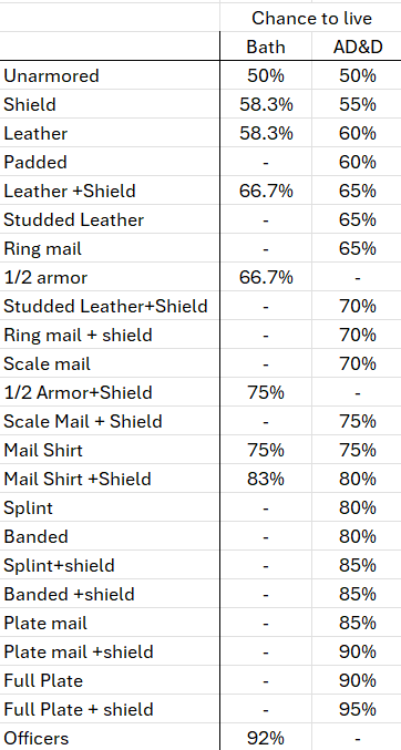 But lets take a step back and look at the unarmored. In both Bath and Gygax, the unarmored man has a fifty percent chance of being hit and killed. It’s a little more complex than that with D&D due to variable weapon damage, and numbers of hit points. But, for the common weapons used against the common man, it’s about fifty percent. These odds match those in Totten for the one to one odds. Two men enter, one man leaves. But what if one man has armor? Assume the armored portion is impervious, then that mail shirt that covers half the body divides the odds in half. With the mail shirt the odds to living raise from fifty percent to seventy-five percent. And that matches the odds in Gygax as well.
