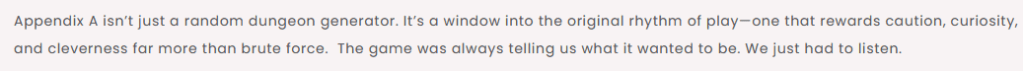 Which is exactly correct. By looking at the statistics of the tables, as Jon does, one can detect the rhythm. The best way is to learn the rhythm by extended play. Nonetheless, looking at the statistics is informative, and can inform one of the nature of the world of AD&D implied by the tables. Also, if one is setting up one’s own world, this can be done through the design of the tables you make. So, looking at Appendix A can be instructive on how to go about doing this, and how changes will affect the rhythm.