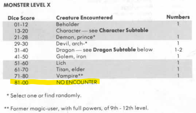 One funny thing is that Monster Level X table. It’s the last one. And, it includes an entry of “NO ENCOUNTER”. This means that in dungeon levels 7-11 the odds of an Appendix A encounter drop from one in eleven, to one in thirteen. And for dungeon levels 12 and down, the odds of an encounter drop to 1/15. The deepest darkest parts of the dungeons are somewhat less populated than the upper parts. I mean, really, who wants to be neighbors with a Balrog? Kind of makes sense?