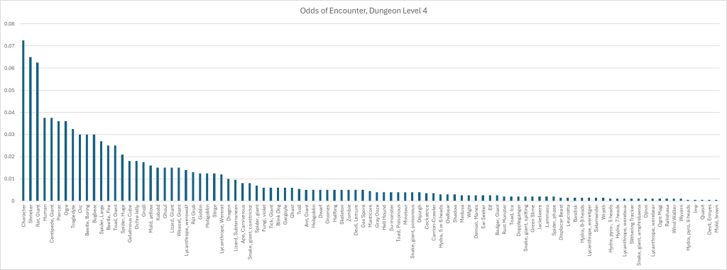 Dungeon Level 4. Giant Rats have been demoted to third place. Shiekers second place, Characters most frequently encountered. Humans and giant centipedes fourth most frequent. Doppelganger, Rust Monster, and Ice Toads the least frequently encountered at two in a thousand. Dragons are now middle of the pack at 1 in hundred.