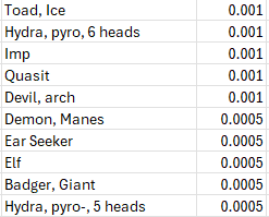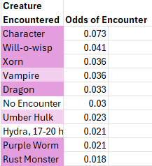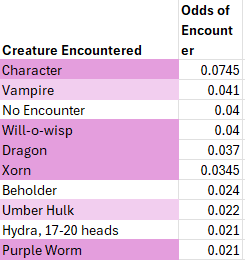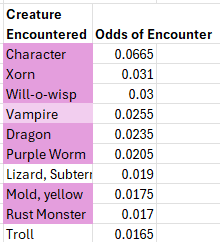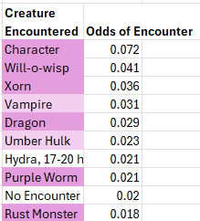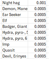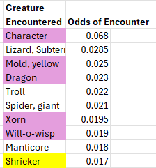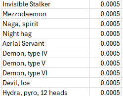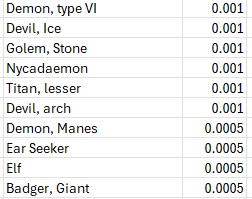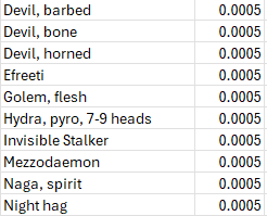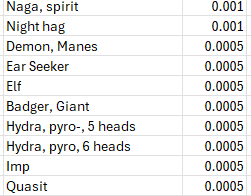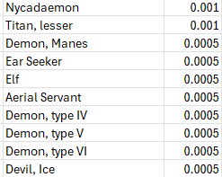 The lowest odds (1/2000) remain an ever expanding list of supernatural creatures (demons, devils, efreeti, golems, ettc.), too many to list succinctly. In aggregate this low probability creatures add up to a full one percent odds of encounting one or another of them.