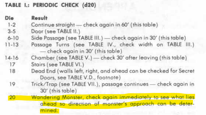Appendix A has two types of encounters, Wandering Monsters and Random Monster Encounters in Chambers or Rooms. But, let’s take a step back. Appendix A presents a method for generating random dungeons. So, primarily, is about determining the geometry of the dungeon itself. But the first step is the Periodic Check.