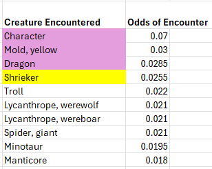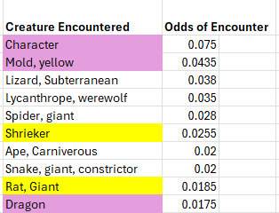 Dungeon Level 5. Character, Shrieker, and, you guessed it Giant Rats, now in place 1, 2,3. Ogres a distant fourth most common. But, dungeon level 5 is a bit different. The Monster Level VI table is added and it adds a host of demons and devils and undead. Green Slime, which many consider a low level dungeon encounter, finally shows up, and at a low encounter frequency of two in a thousand. Dragons are now in the top quarter of encounters with a 1.4 percent chance of occurring.