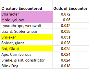 The next most common encounter is the Shrieker. Now this is problematic when looking at odds. Because the whole point of the shrieker is to make noise, which forces wandering monster rolls. How, many wandering monster rolls will depend on the cleverness of the players, so this is a good demonstration that statistical analysis only goes so far. Finally, the fourth most common encounter is the first true monster, the Orc. But, even Orcs, famously overused, only appear 9.6% of the time. Less than one in ten dungeon encounters will be orcs.