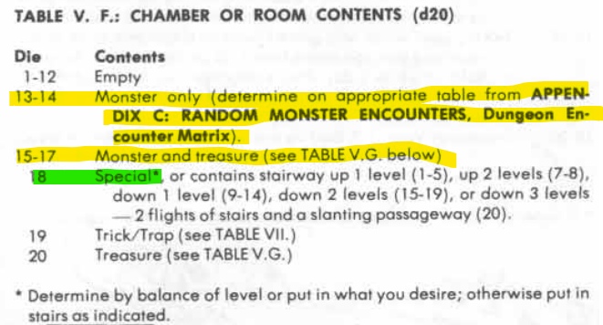 From the Periodic Check table one can see that in two of the entries are not architectural. There is a Trick/Trap entry and a Wandering Monster entry. For the purpose of this discussion I’m only interested in the Wandering Monster entry, but it is worth noting that Appendix A not only generates the dungeon but the hazards of the dungeon, and also (as Jon notes) the rewards of the dungeon. For here though, not one in twenty periodic checks will be Wandering Monsters. Really one in twenty-one checks as the Wandering Monster check says to roll again to see what’s ahead. The other thing to notice is that Chambers are encountered three times out of twenty rolls.