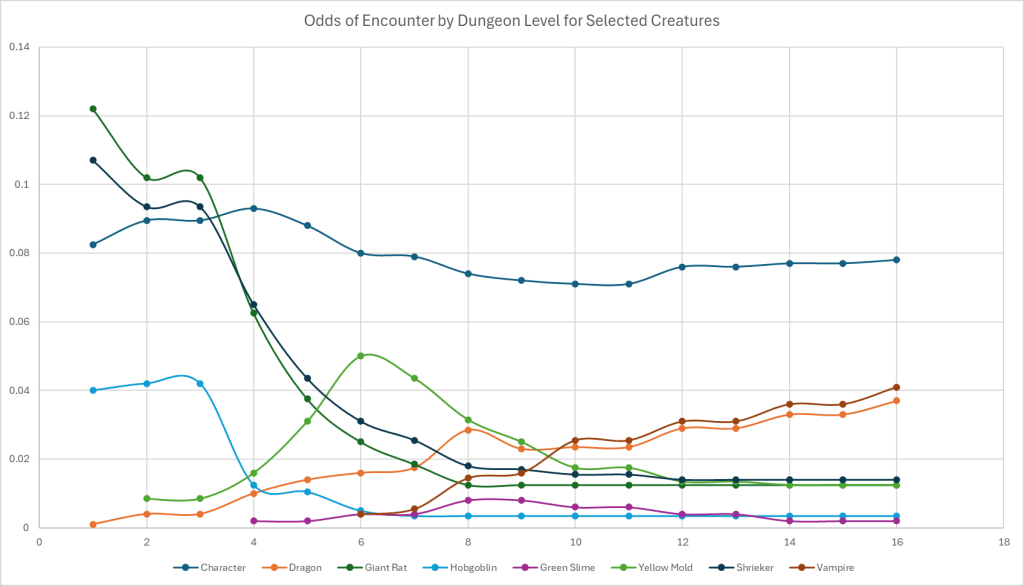 Characters remain fairly consistent in frequency throughout the levels. Dragons start out possible but extremely rare and slowly become fairly common. Vampires are not seen on upper levels then shoot up in the deeper levels to challenge dragons in frequency. Other dungeon hazards thought to be common, like yellow mold and green slime, really are features of the middling levels then drop off in popularity. While the lowly giant rat starts out strong but rapidly drops to a rather steady frequency.