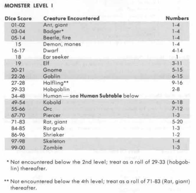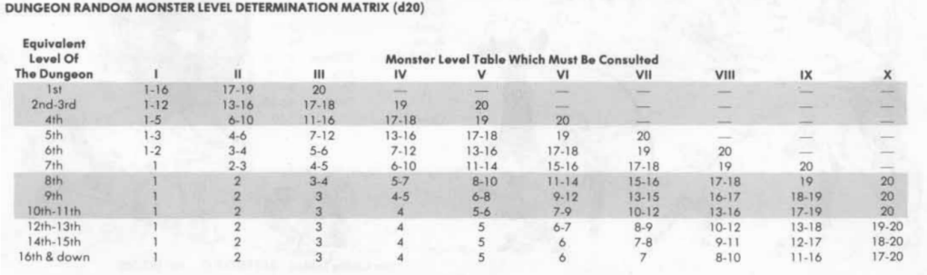 The takeaway from this is that the Monster Level encounter tables do not correspond to the level of the dungeon. They don’t even correspond to the hit dice of the monster, though, in general the monsters get tougher as one works up the tables.