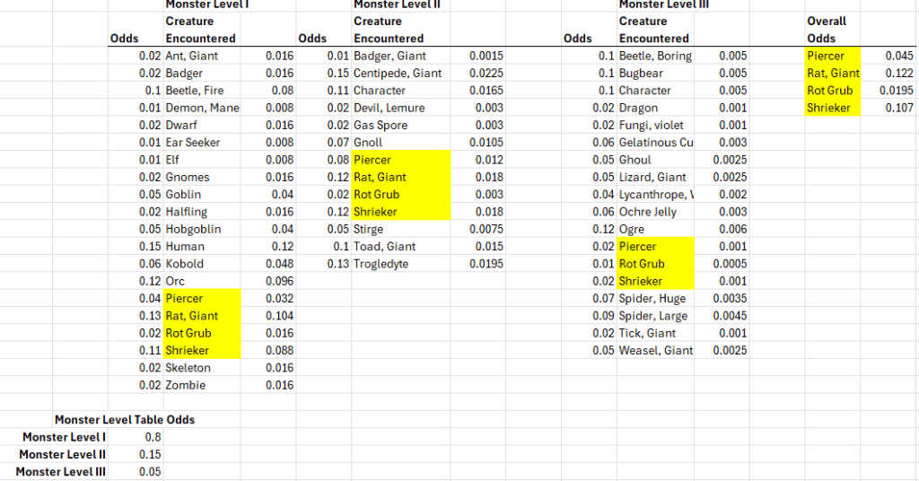 What, then, is likely to be encountered. Here I’ve only looked at dungeon levels one through three. Both to limit the work, but also hirelings will not venture below level three so, the character of adventure in the lower levers of the underworld changes. In any case, as the tables say, we must check Appendix C for what monsters are encountered. Specifically the Dungeon Encounter Matrix.
