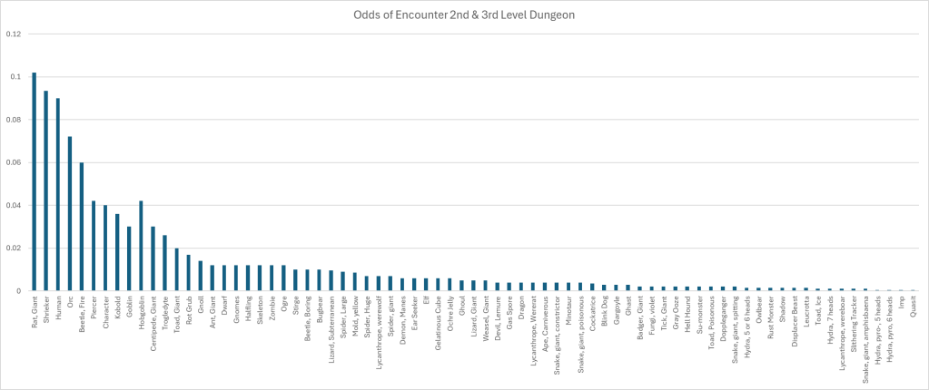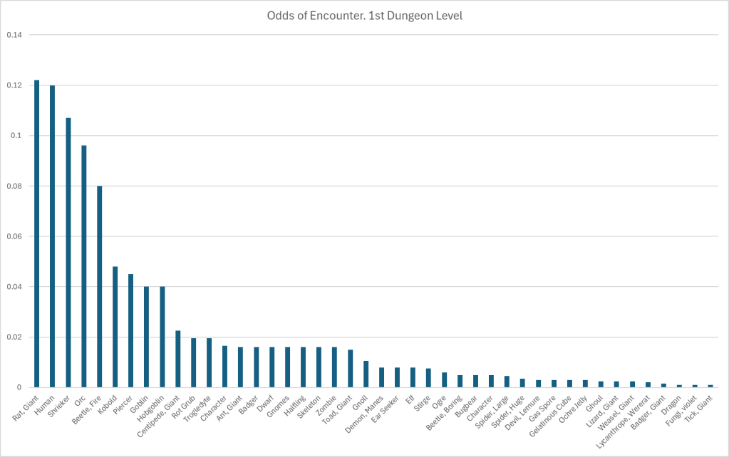 The chart here is probably hard to read. The most common encounter remains, guess what, giant rats. Shriekers knock humans down to number three in frequency. Then in fourth place again, Orcs. Orcs though drop in odds to 7.2 %. Dragon is not the bottom of the list now. In fact the odds of encountering a dragon quadruple to four in a thousand. And, the bottom of the list is Imps and Quasits each at 5 encounters per 10,000 rolls, 1 in 2,000. Some might note there is an odd man out on this table. What is that blip upwards in the first third of the odds. That is Hobgoblins. It should be shifted up to sixth place. Hobgoblins get shifted upward because of the footnote on Monster Level I table that notes that Badgers are not found deeper than the 2nd level of the dungeon. So, really, this table only represents level three. For the level 2 version, just visualize Badgers occurring 1.2 % of the time. and Hobgoblins 3%.