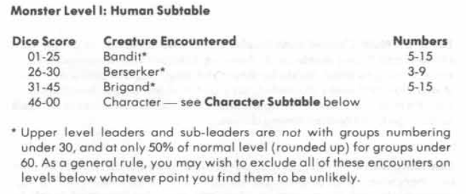 Most common encounter on the first level of the dungeon probably comes as no surprise, giant rats. But the next most common might surprise some, it’s Humans. Now, Humans have their own table, Bandits, Berserkers, Brigands, and Characters. Characters is interesting because humans more often than not (55% of the time) will be other Characters. Those looking closely at the table will see Characters represented as a 1.6 percent chance of an encounter. This is because Characters are also shown as a separate encounter on Monster Level Tables II & III. Characters are Classed characters. The more bold classed characters will do so. In fact, Characters show up on all the Monster Level table except Monster Level I. Classed character really show up on Dungeon Level I, 8.25% of the time and other Humans, 5.4% of the time. The tables are tricky that way.