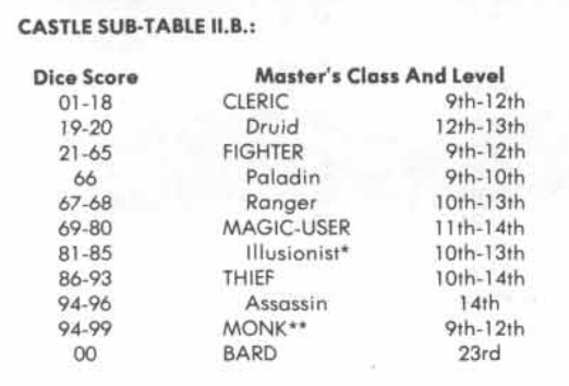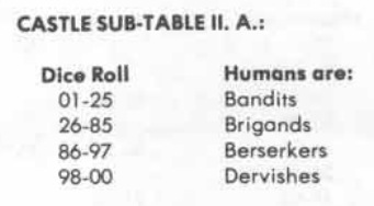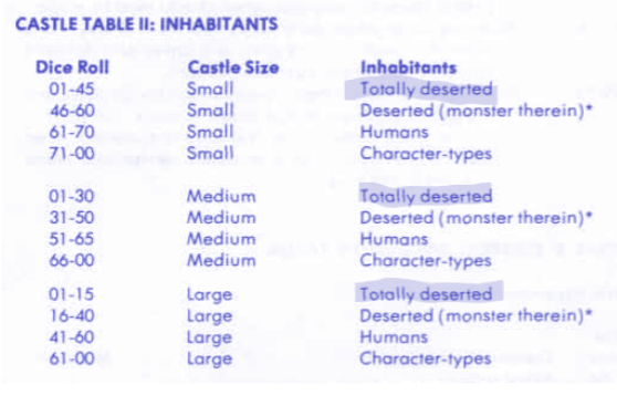 This all stood to reason since the overall odds of being deserted were previously calculated at 51.1%. Castles can be occupied by either Humans or Characters. Humans in this case are either Bandits, Brigands, Berserkers, or Dervishes as described in the Monster Manual.