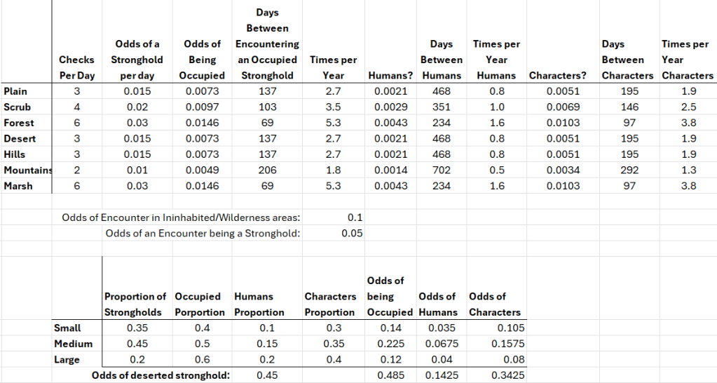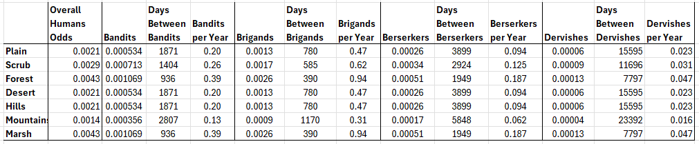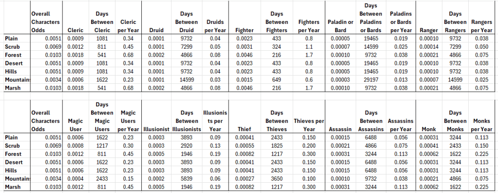 What does it all add up to? Well, it varies based on terrain of course, but roughly an exploring party will run into an occupied castle two to five times per year. Interestingly, running into character types, across all terrains is more common than running into other Humans.