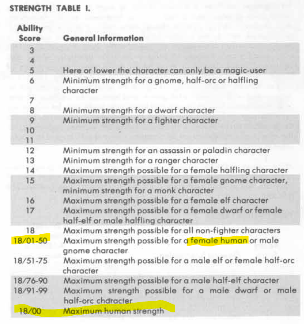 The Player’s Handbook, page 9 has Strength Table I which shows maximum and minimum strength categories based on race, sex, and class. From the table we can see that males humans are allowed a maximum strength of 18/00, while female humans are allowed a maximum of 18/50. Of course, the percentile strength is allowed only to characters that choose one of the Fighter classes (Fighter, Paladin, Ranger). All other human classed characters are allowed a maximum of 18 strength, male or female. Even at first, one can see that the strength limitation for humans in AD&D is rather modest between the sexes. Only female characters lucky enough to roll an 18 strength (0.46% chance) and also choose to become fighters are limited. This means that of those players choosing a female character fighter, only 0.23% of characters with have their strengths truncated. This is not a very liked or onerous limitation. Despite this many have complained about it.