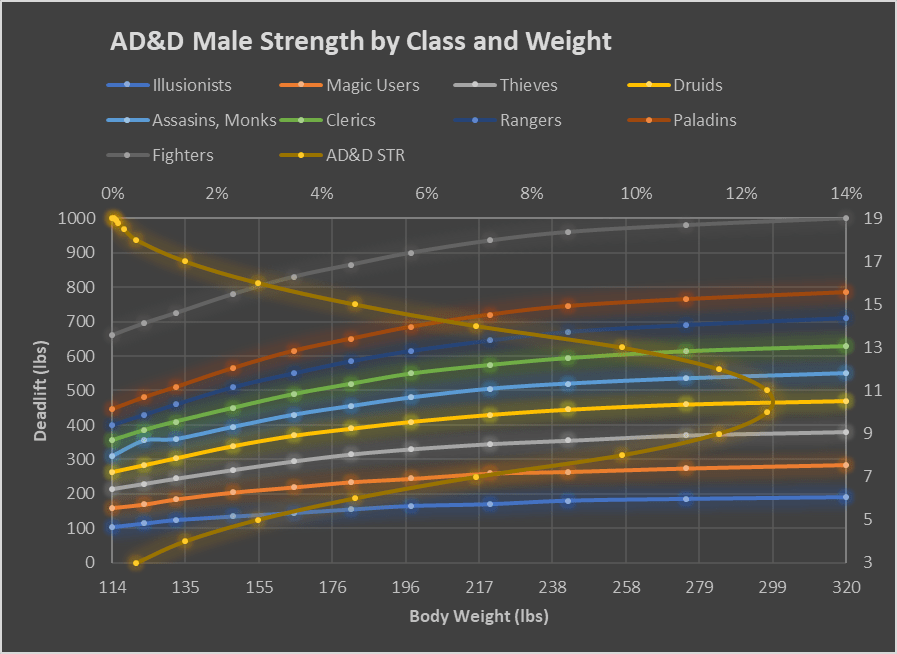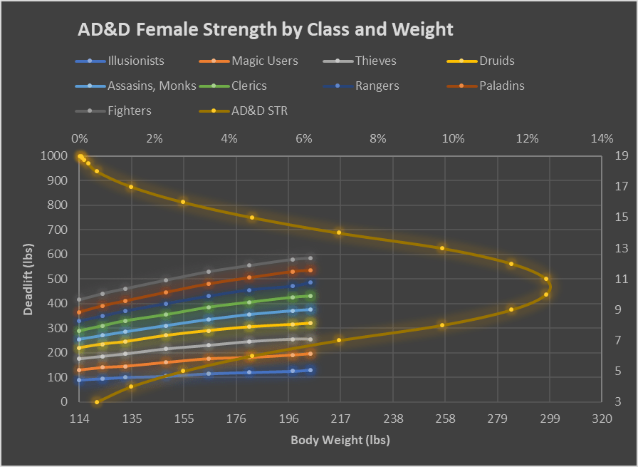 On these charts we have body compared to deadlift weight on the left axis. On the right axis is the normal 3d6 bell curve (with the percentiles between 18 and 19. Note that 19 on the chart is really 18/00, but for ease of representation on the chart 19 has been used. In addition, I’ve roughly divided training levels by class type, given how much emphasis on melee combat for the class there is. If I update this I’ll likely make broader categories by class. Fighter, paladin and ranger combined, magic user and illusionist, etc. But this gives a general idea where the classes might lay among the real world data.